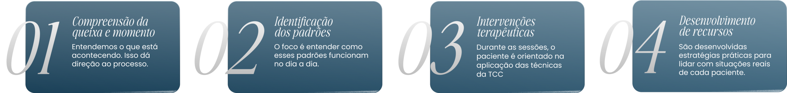 A Terapia Cognitivo-Comportamental (TCC) é uma abordagem que ajuda a compreender a relação entre pensamentos, emoções e comportamentos. É prática, estruturada e baseada em evidências científicas e ao longo do processo, são desenvolvidas ferramentas para lidar melhor com os desafios emocionais do dia a dia. O processo baseia-se em: